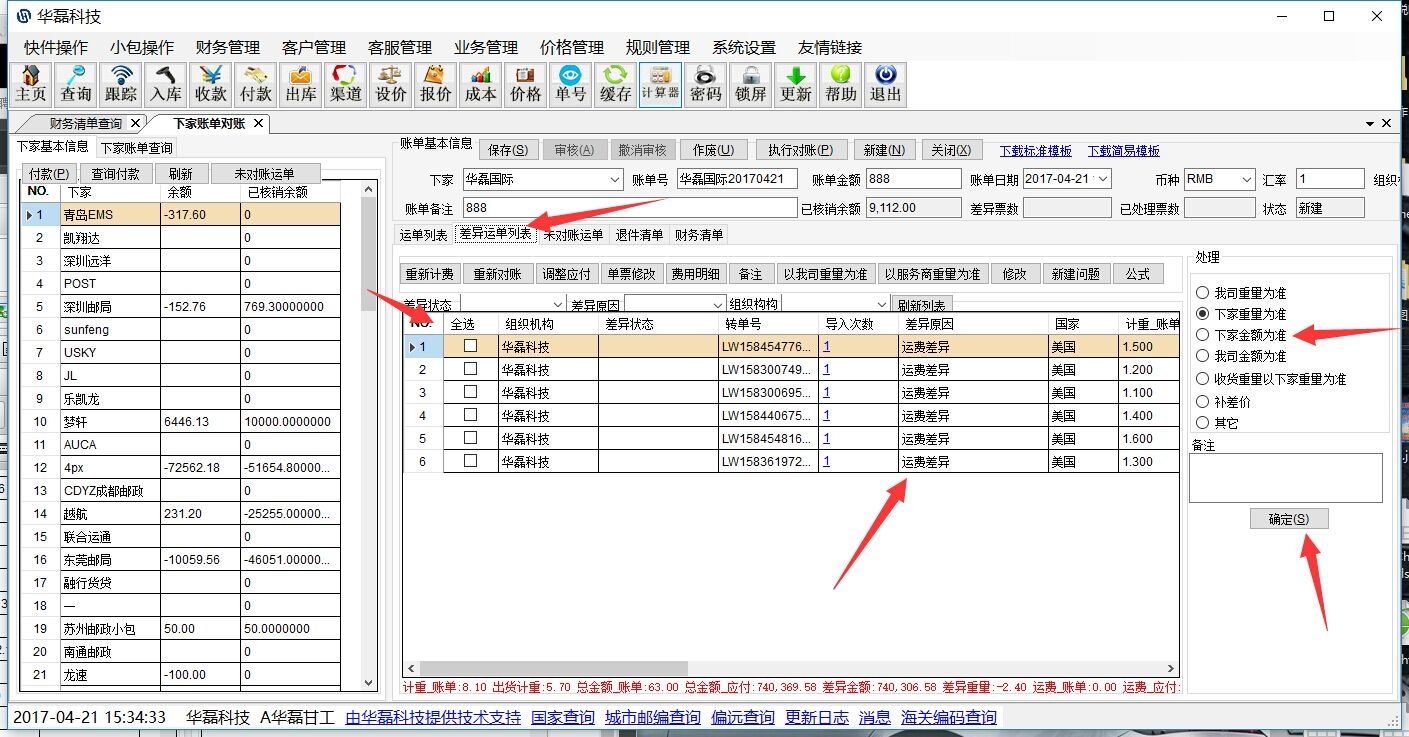 华磊系统——财务管理——下家账单对账———先下载对账模板做好表格,把下家给你的账单复制数据到我们的模板上面。 2,新建选下家——生成账单号(一天多个的可以修改)———备注——点保存————浏览表格———保存————执行对账 3查看差异列表————(有问题的和下家校对)————选中————选对应的情况————保存 4,刷新列表,会显示该账单的应付总金额。(如果是存在多次对账的,只能单独填写对应的实际应付金额) 5.付款给服务商有两种方法, 方法一,直接在付款图标里面新建一笔总的金额,这种方式不关联单号。 方法二,在财务管理,下家批量付款,找到对应对过账的单号,勾选付款对应的金额。