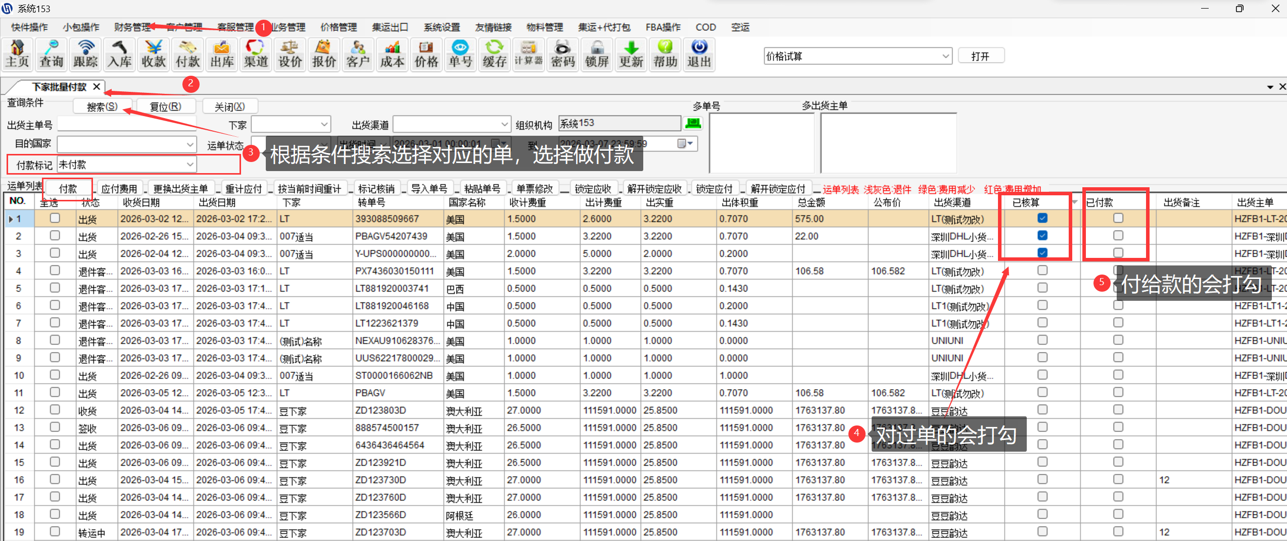 方法二,在财务管理,下家批量付款,找到对应对过账的单号(一般根据对账单号搜索),勾选付款对应的金额。