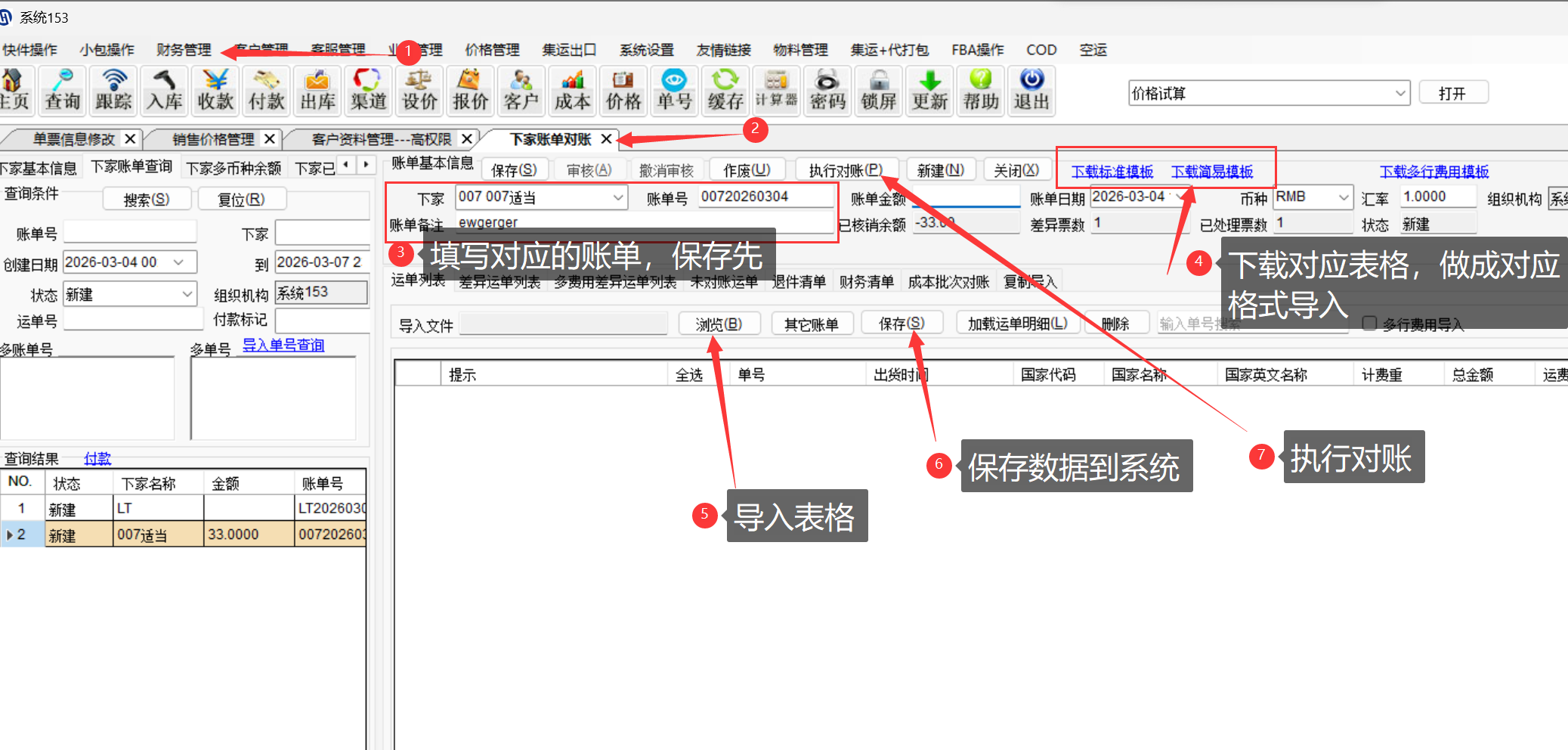 华磊系统——财务管理——下家账单对账———先下载对账模板做好表格,把下家给你的账单复制数据到我们的模板上面。