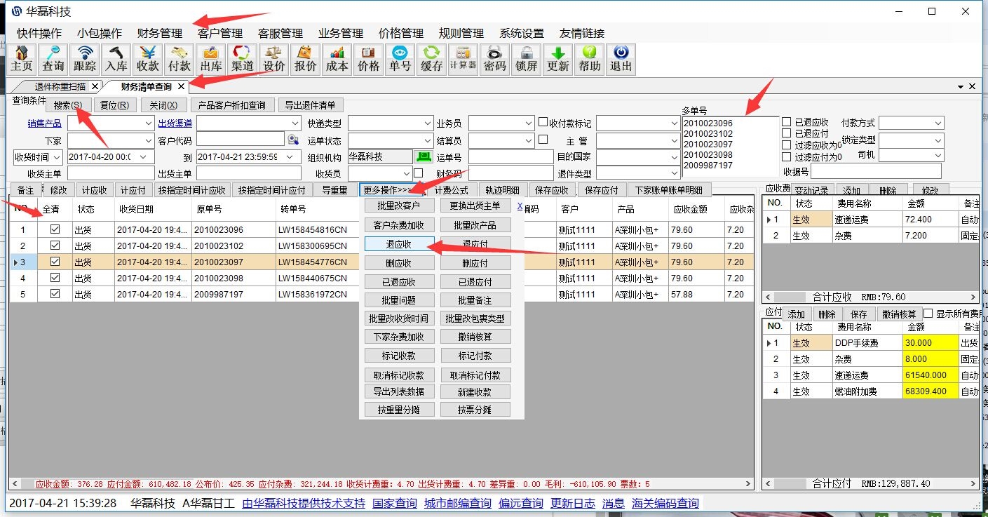 财务管理———财务清单查询———搜索对应的单号————选中————批量操作————退应收(退的是全部费用)