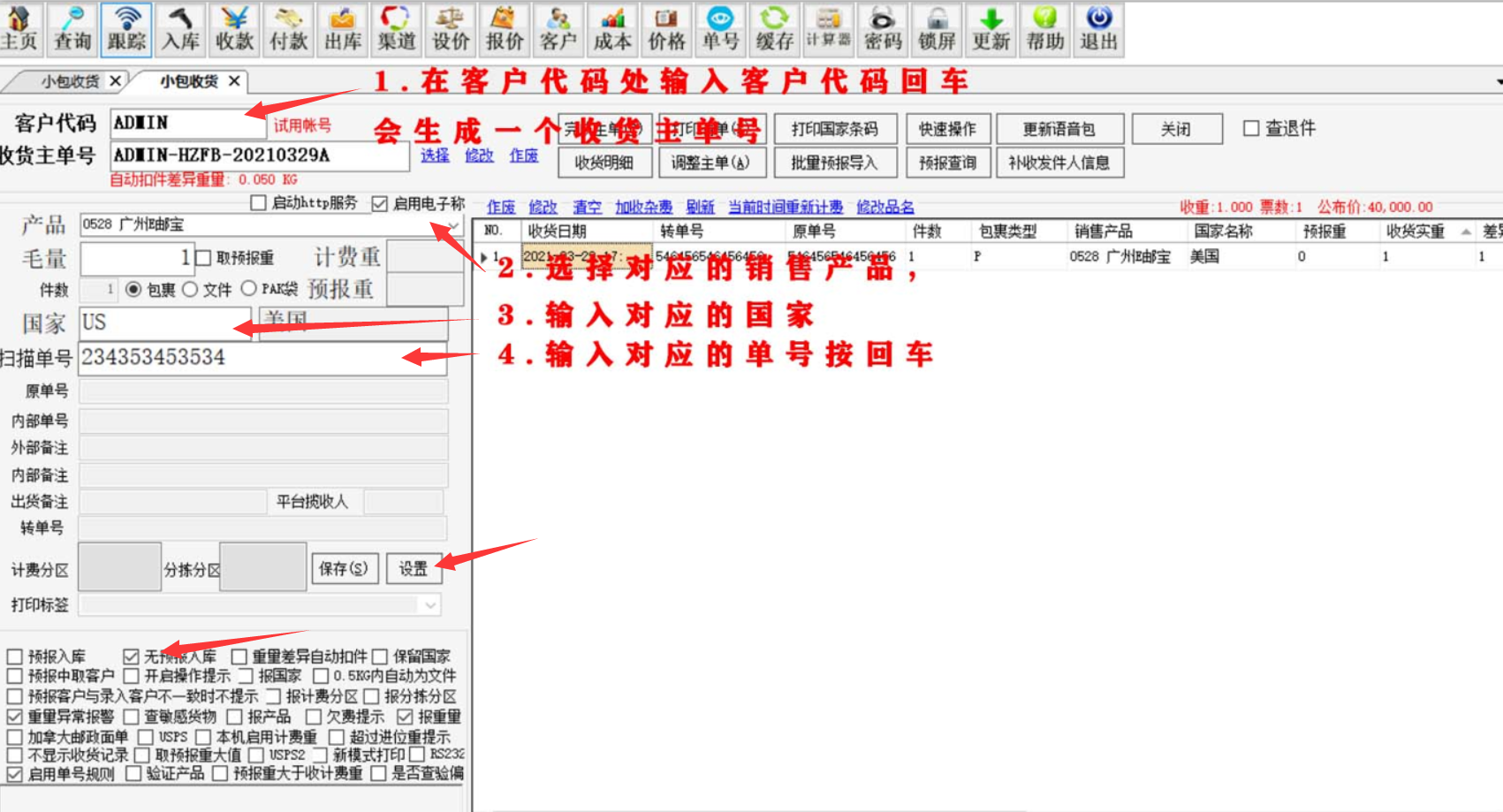 有在网页下单的预报的,看的预报入库 预报入库,点开设置,把 里面的预报的 勾选 图(1.8-3) 当这批次完成后,记得点完成主单; 说明入库其实就是小包操作的收货,主要完成收录清点、核算货物重量、费用应收等作用。 无预报收货,按下图说明 小包操作-小包单票收货如图(1.8-1) 图(1.8-1)