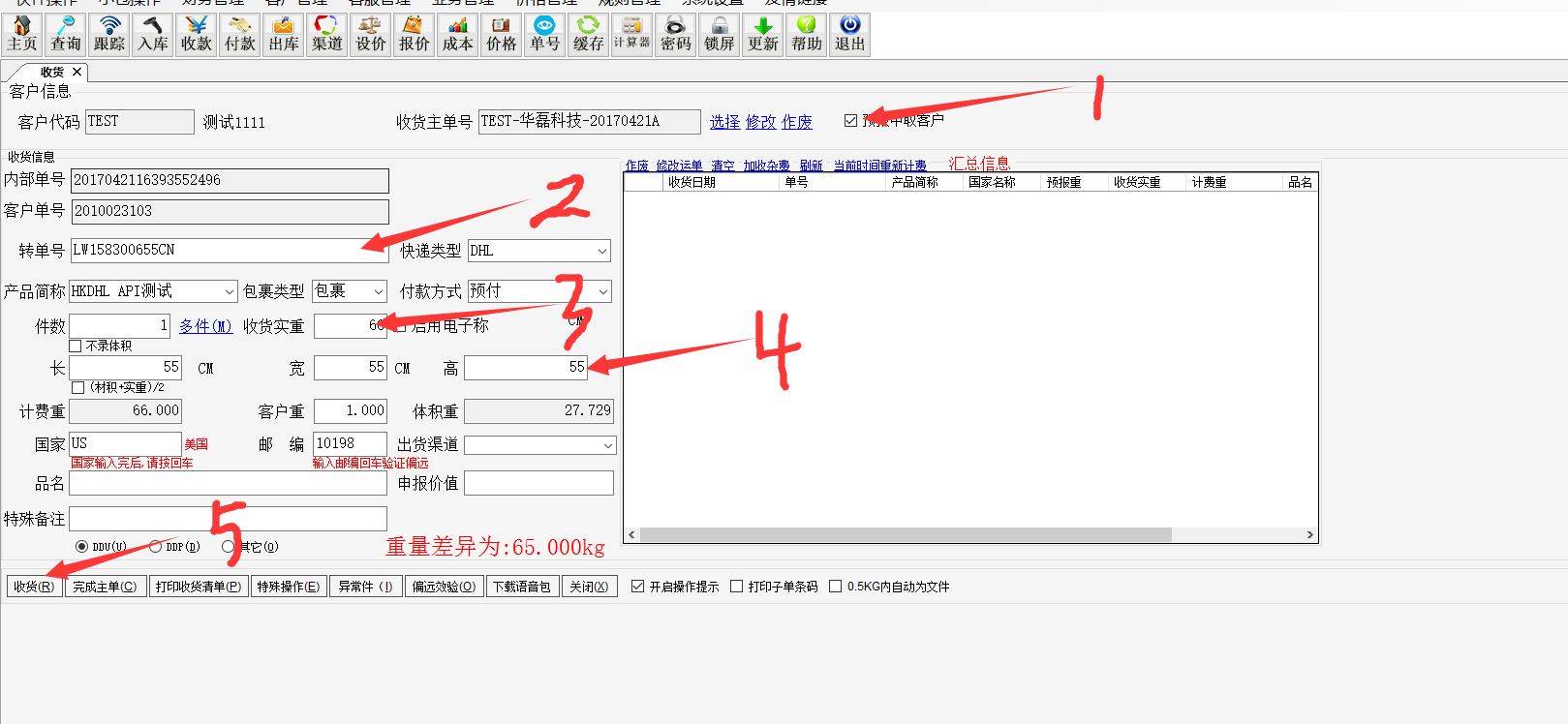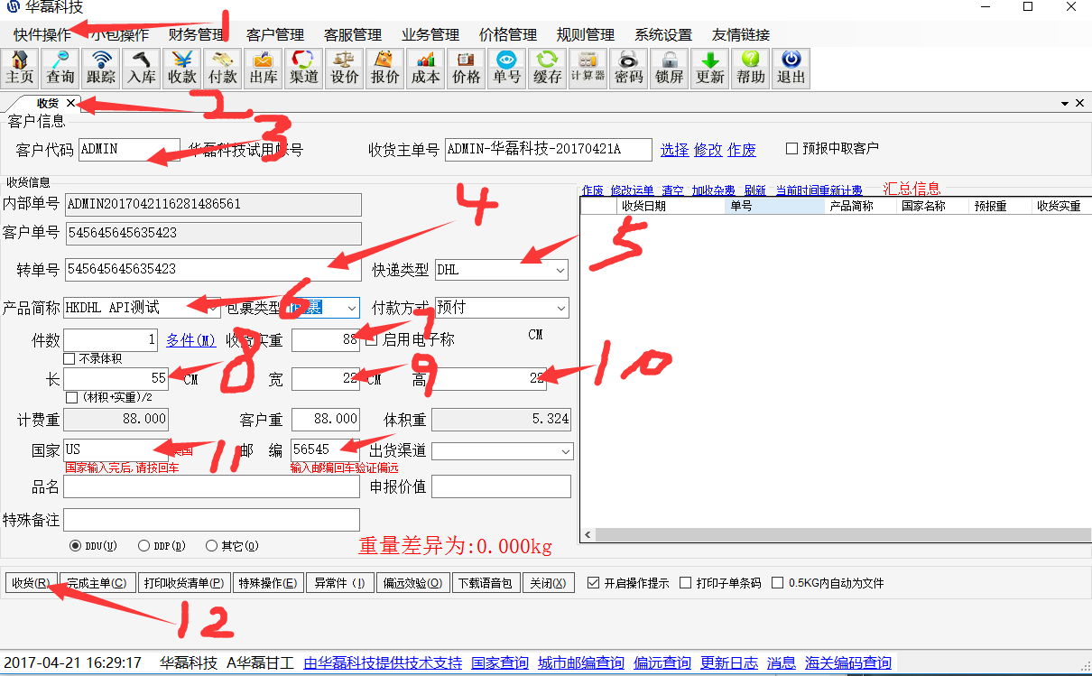 1系统点快件操作----2收货(无预报方式)———3输入客户代码(之后回车键,收货主单号会自动生成,不用自己填写)————4扫描客户的单号————5选择对应的快递类型————6选择对应的产品————7对应的重量————8,9,10填写对应的体积(多件的,把里面的件数填对应的件数)————11填写对应的国家和邮编————12收货 如果客户是在平台下单预报的,可以快捷方式(如下) 勾选取预报客户————扫描单号(手填的要回车键)————重量————体积————收货