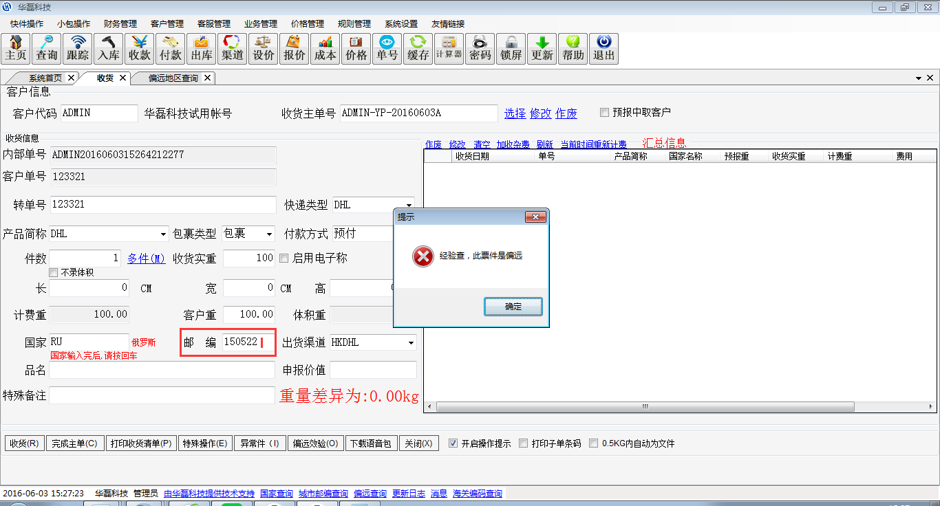 第二步:在现实场景中,操作在收货,在这个环节如果收到有偏远的运单,系统将会提示操作员