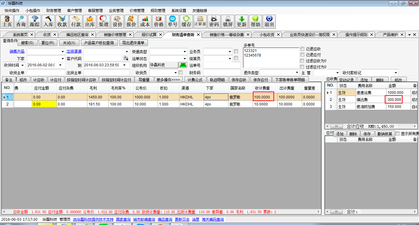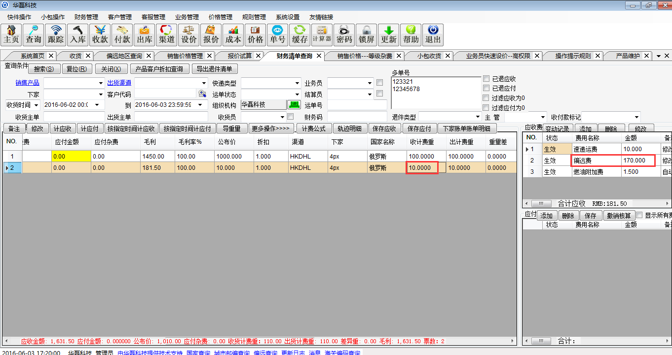 ————接下来就是应用到刚才预设好的费用规则了,操作员标记这票运单是特殊类型“偏远地区”,这时系统自动将加收费用在这票货上