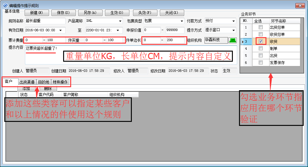 第三步:在收货环节会自动验证操作规则并且以窗口弹出提示