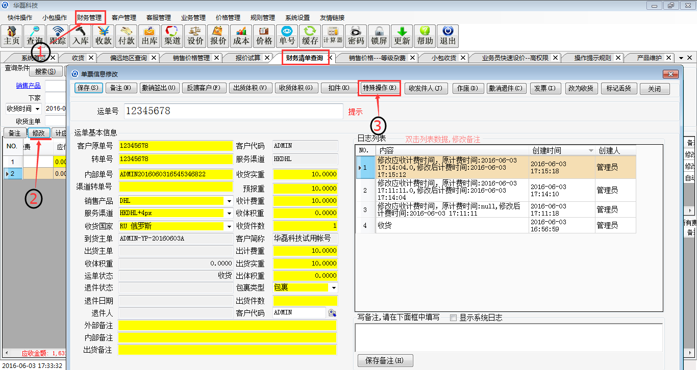 可以在“财物清单”找到这个单号,点“修改”看到“单票信息修改”界面,在这里标记特殊类型,方法和前面一样
