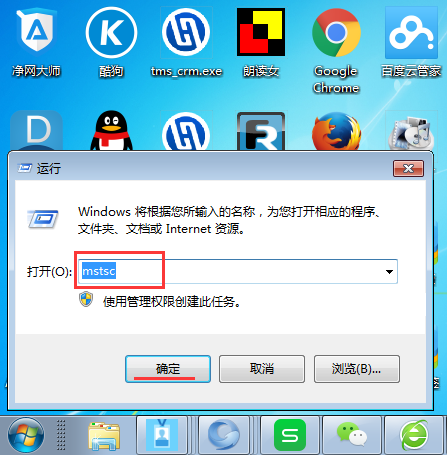 2、在左下角弹出的新窗口,将“mstsc”复制到填写框中,然后点确定或者按回车键