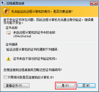 5、验证成功后会弹出一个新的窗口,点击“是”,系统自动进入服务器远程桌面端
