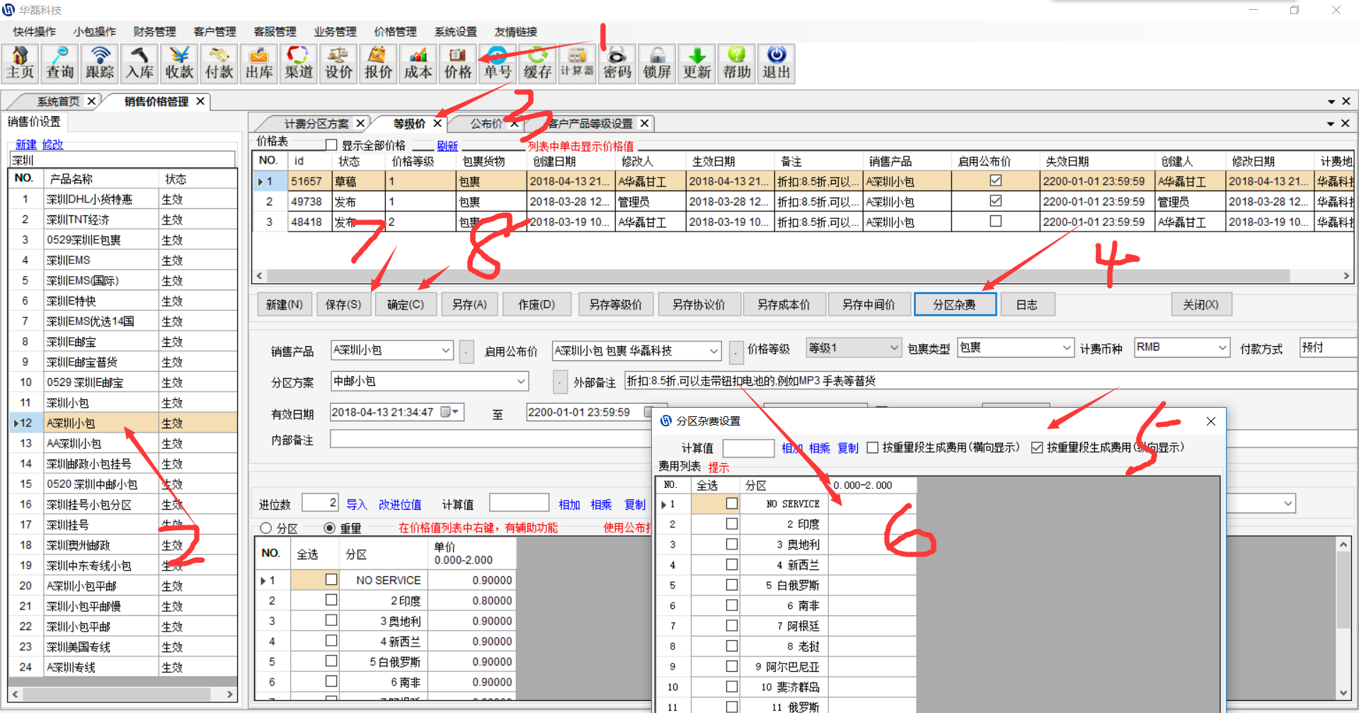 先刷新一下这这里两个按钮 如果是有不同的分区杂费的,设置在下面这个位置,公布价带过来的杂费要进来保存才生效,杂费可以复制粘贴进来。如果是杂费要打折的,可以全选,乘以折扣。杂费只能是这个价格表草稿状态才能修改。